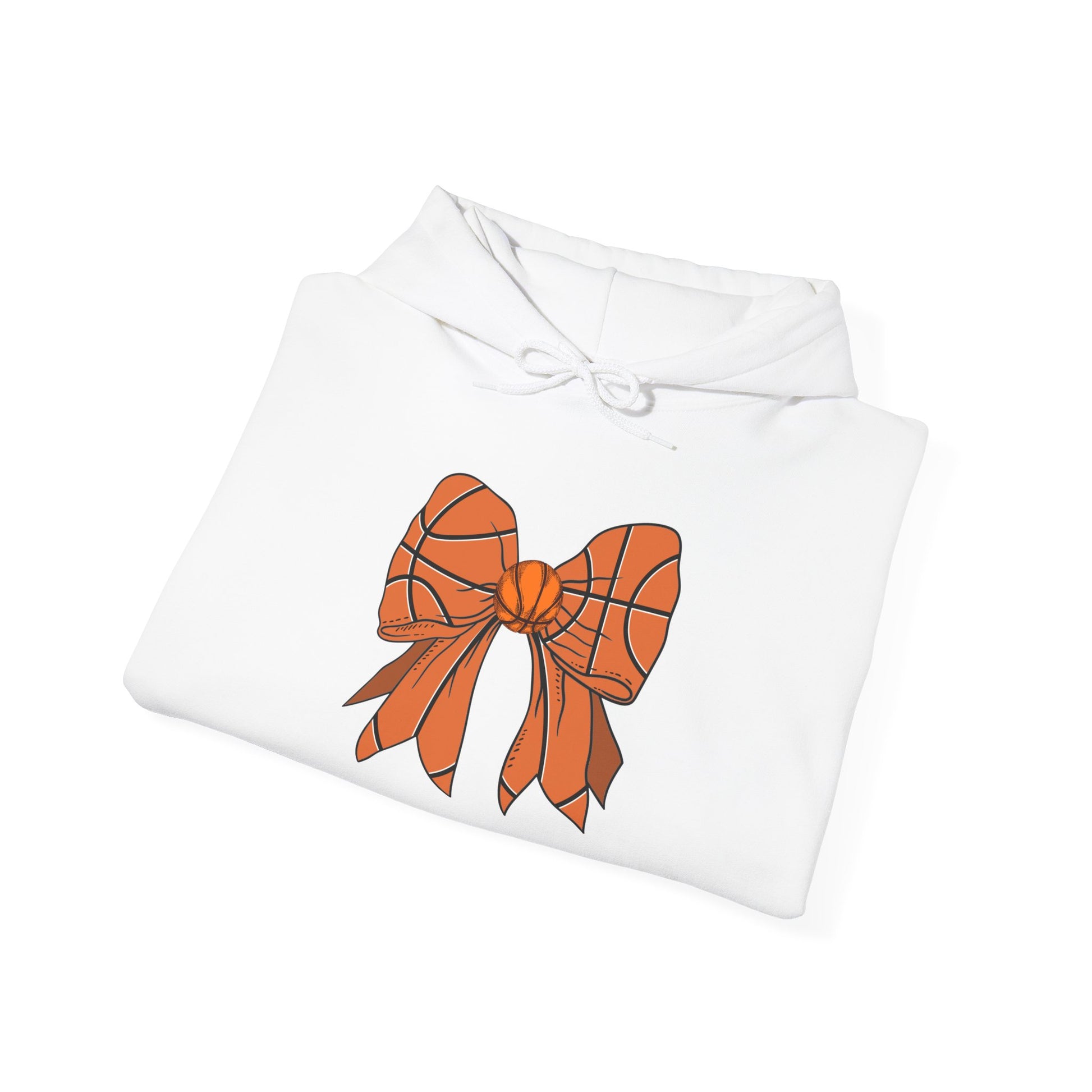 This cozy hooded sweatshirt blends sporty spirit with playful charm. The front features a hand-tied bow rendered in basketball-textured orange, a small, whimsical nod to court-day style. On the back, a bold varsity-style number 11 sits framed by a repeating pattern of mini basketballs and tiny bows — a design that reads like a team jersey with a feminine, fun twist. Soft and warm, the hoodie’s roomy pouch pocket and adjustable drawstring hood make it comfortable for cooler practices, post-game hangouts, or slow weekend mornings. The clean white background lets the orange and royal-blue details pop, so the design stays visible from a distance while remaining wearable for everyday life.
